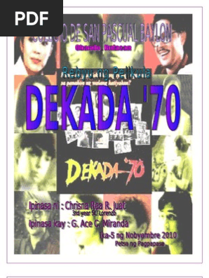 Panahon Pangunahing artikulo Kasaysayan ng Pilipinas - Batas Militar. Para sa pelikula tingnan ang Dekada 70 pelikula. Contextual translation of ano ang kakalasan ng dekada 70 into English.