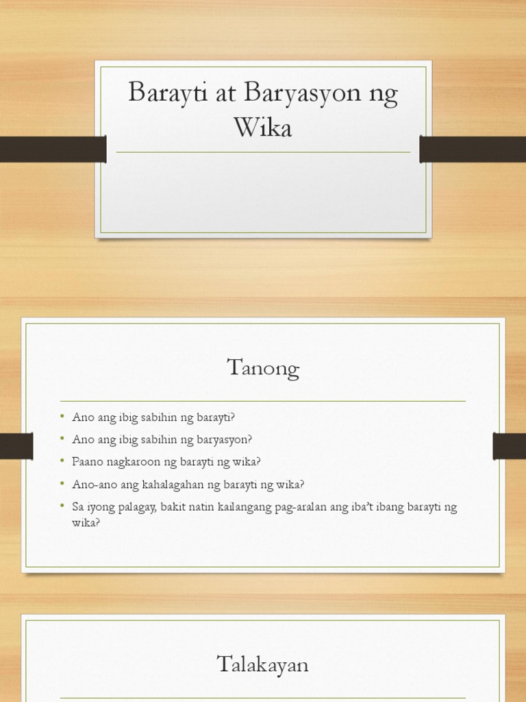 Ang pagkakaroon ng barayti sa wika ay hindi dapat tingnan sa negatibong pananaw. Kunin bilang halimbawa ang wikang Ingles. Learn vocabulary terms and more with flashcards games and other study tools.