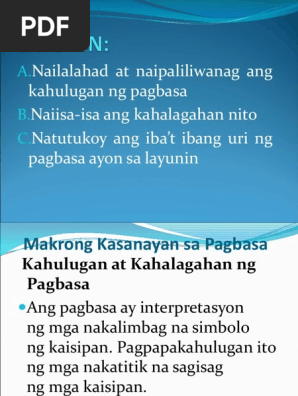 Read Pagbasa from the story Filipino 104 by FrancissJamess with 902 readsKahulugan at Kahalagahan ng Pagbasa Ano ba ang pagbasa Kahulugan at Kahalagahan ng Pagbasa S. U N A N G PA G - A A R A L A N Simula sa araw na ito WALA NG DIBISYON sa ating pag-aaralan sa APP6 Filipino sa Piling Larangan ANunsyo Layunin Pagkatapos ng araling ito inaasahang maisasagawa ng mga mag-aaral ang sumusunod.