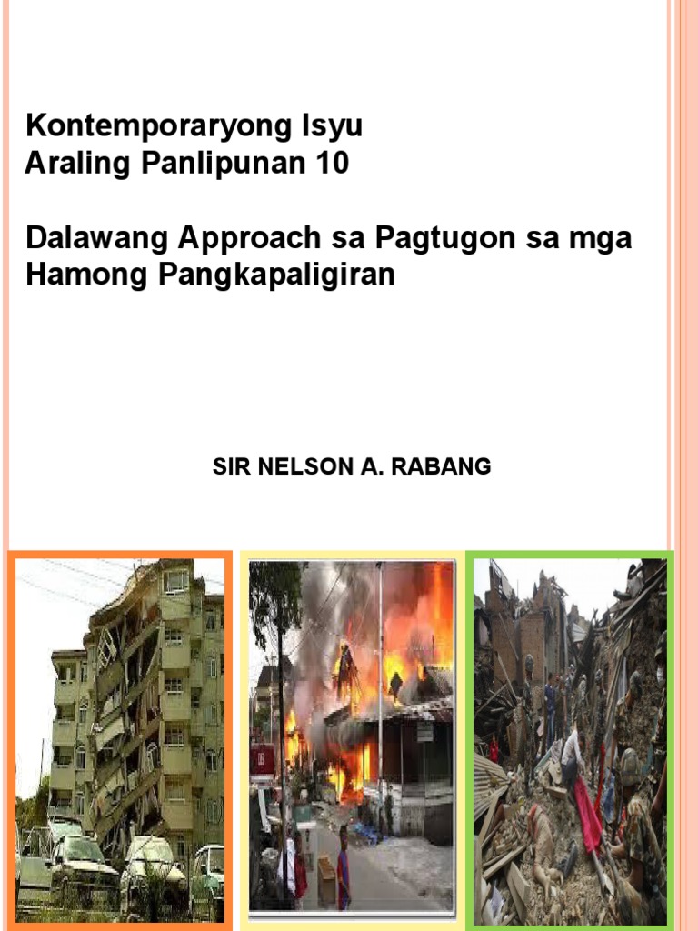 Halimbawa ng mga Best Practice sa pamamahala ng Solid Waste Sanggunian. ANG DALAWANG APPROACH SA PAGTUGON SA MGA HAMONG PANGKAPALIGIRAN DISASTER MANAGEMENT K O B I D K OMUNIDAD NA O RGANISADO AT B ALANSE I MPORTANTE SA PAGHARAP NG D ELUBYO Alamin Sa araling ito ay pagtutuonan mo ng pansin ang dalawang approach na ginagamit sa pagbuo ng isang plano na makatutulong upang maihanda ang sarili at komunidad sa mga hamong pangkapaligiran na hindi natin maiiwasan na mangyari. Jul 08 2017 Tatalakayin sa araling ito ang kalagayang pangkapaligiran ng Pilipinas at ang pagtugon na ginagawa upang ito ay mabigyan ng solusyon ALAMIN Bago tuluyang tuklasin ang hamong pangkapaligiran na kinakaharap ng sangkatauhan subukin muna ang iyong kaalaman tungkol sa paksa sa pamamagitan ng pagganap sa mga inihandang gawain sa bahaging ito.