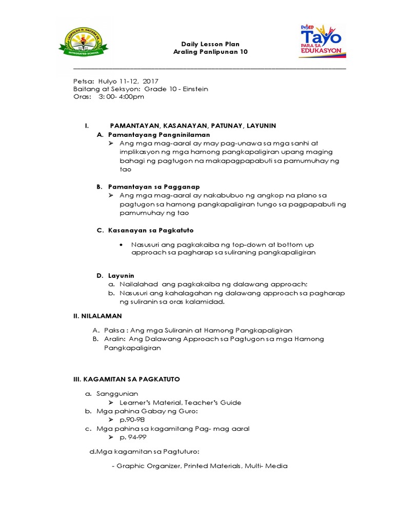 - e-edukasyonph Ang kahinaang ito ng top-down approach ang nais bigyang. MGA TIYAK NA LAYUNIN. PAMANTAYAN SA PAGGANAP Nakabubuo ng angkop na plano sa pagtugon sa mga hamong pangkapaligiran tungo sa pagpapabuti ng pamumuhay ng tao.