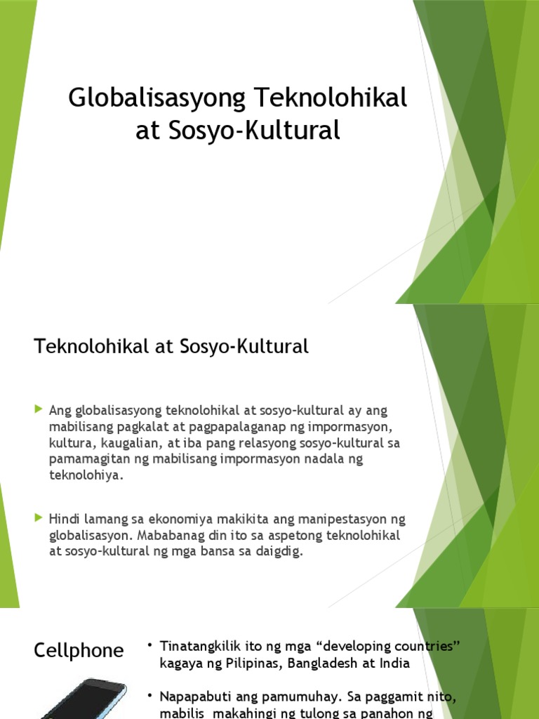 Mababanaag din ito sa aspetong teknolohikal at sosyo-kultural ng mga bansang daigdig. Negatibong epekto ng globalisasyon sa aspektong sosyo kultural pagkawala ng. Mabilis na tinangkilik ng mga mamamayan sa developing countries ang paggamit ng cellular phones o mobile phone na nagsimula sa mauunlad na bansa.