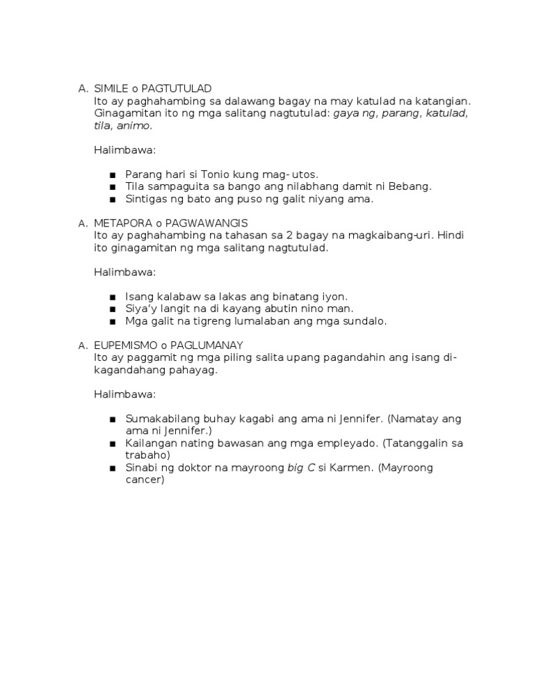 Pagtutulad o Simili Ito ang di-tiyak na paghahambing ng dalawang magkaibang tao bagay o pangyayari. Uri ng Tayutay Mayroong dalawampung 20 uri ng tayutay. PAGLINANG SA TALASALITAAN Ibigay ang kahulugan ng mga salitang nasa loob ng biluhaba ayon sa pagkakagamit ng mga ito sa tulaIsulat sa sagutang papel ang mga sagot.