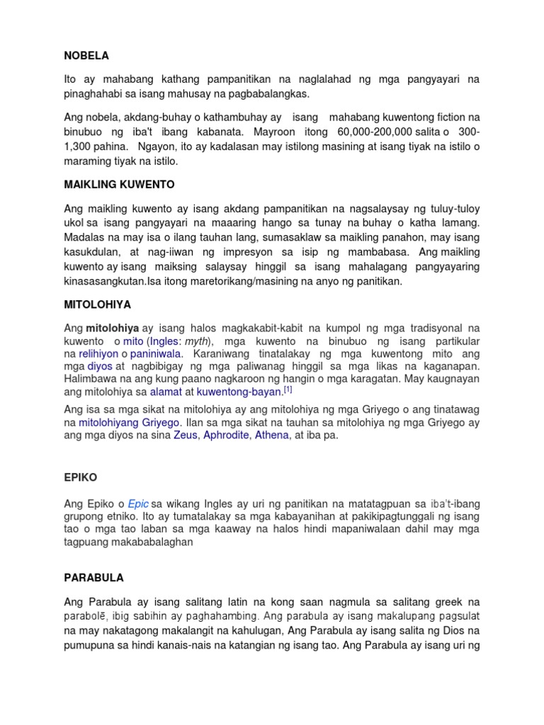 PANITIKAN Sa paksang ito malalaman natin ang kahulugan ng panitikan ang dalawang uri at ang dalawang anyo na may halimbawang akda ng bawat anyo. Timawa- isa itong uring panlipunan na katumbas ng Malayang tao sa panahon ng mga maharlika. Ang nobela ay binubuo ng mga yugto na nagsasalaysay ng mga kawing- kawing na pangyayari ng buhay ng mga tao na bukod sa nagbibigay-aliw ay nagpapakilos at pumupukaw sa damdamin at kamalayan ng mga mambabasa.