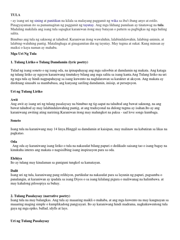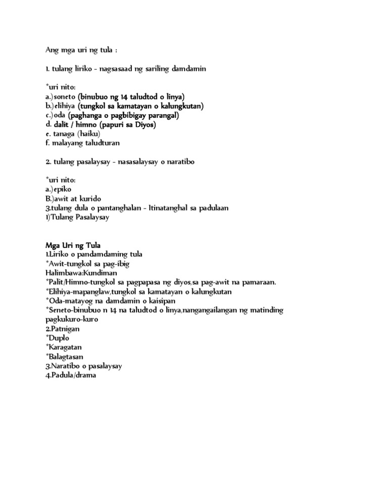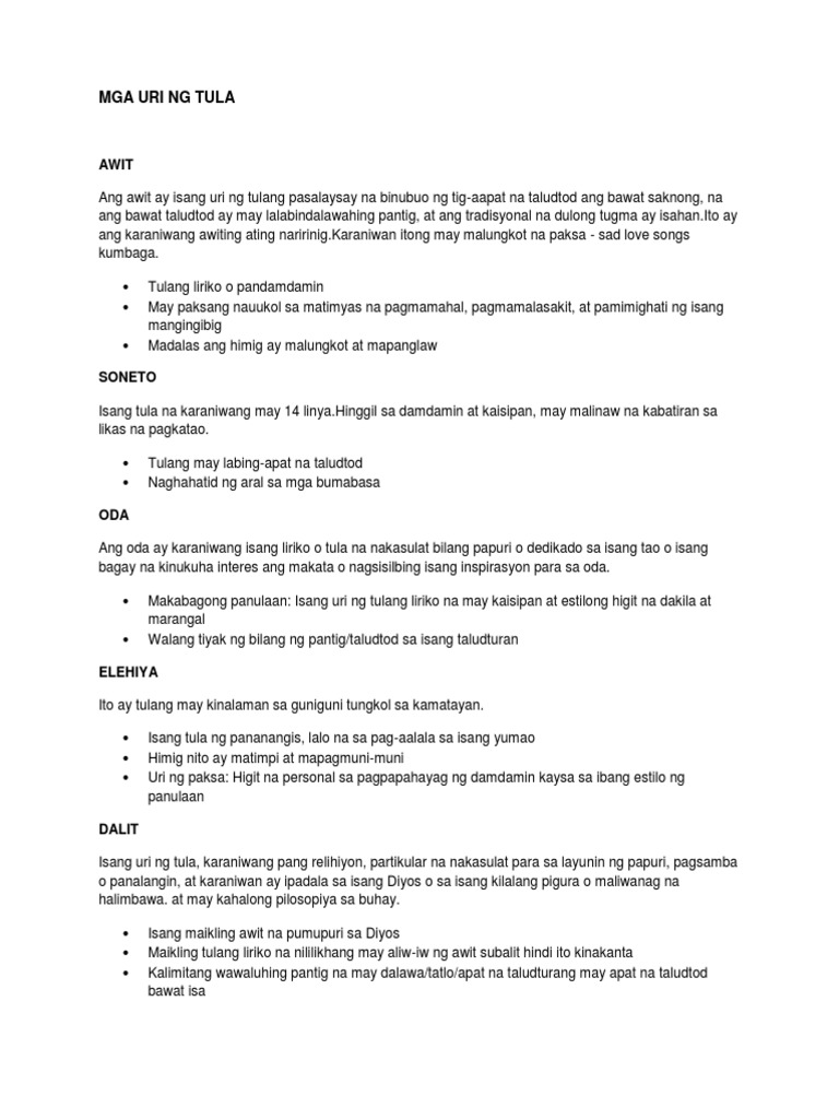 Mga Uri Ng Tula Type Of Tula Studocu