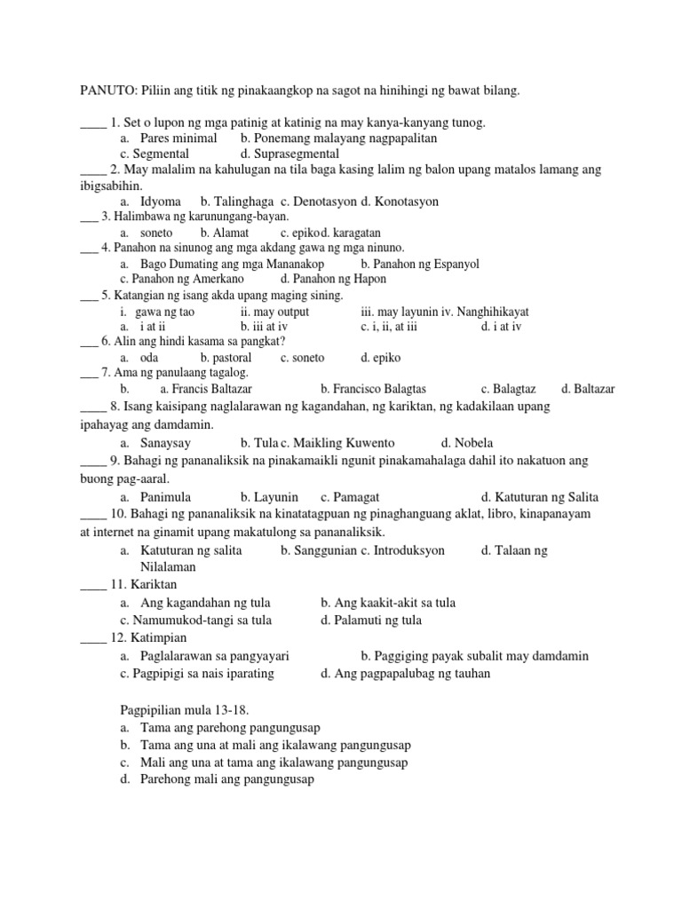 A kulang b bitin c sobra d maliit 3 Piliin ang kasalungat ng salitang diretso. 27 minutes ago by. Mga tanong sa Tagalog Literature and Language Names and Name Meanings US in WW2.